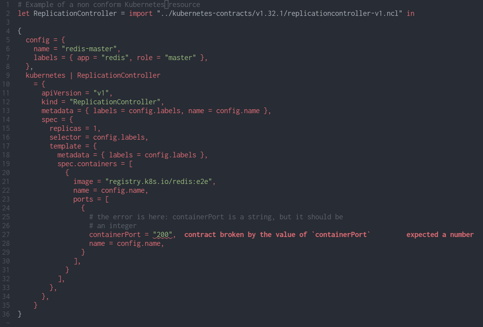 NLS has also gained the ability to offer diagnostics for evaluation errors. This is very useful in Nickel because contract errors are detected during evaluation instead of during typechecking. In-editor detection of contract violations is part of the vision articulated in a previous blog post, where configuration errors are left-shifted (because you get them as you type) and infinitely customizable (because contracts are arbitrary code). Since the previous post was written, the diagnostics have been further improved thanks to the contract improvements mentioned above: the problematic field now gets highlighted directly.